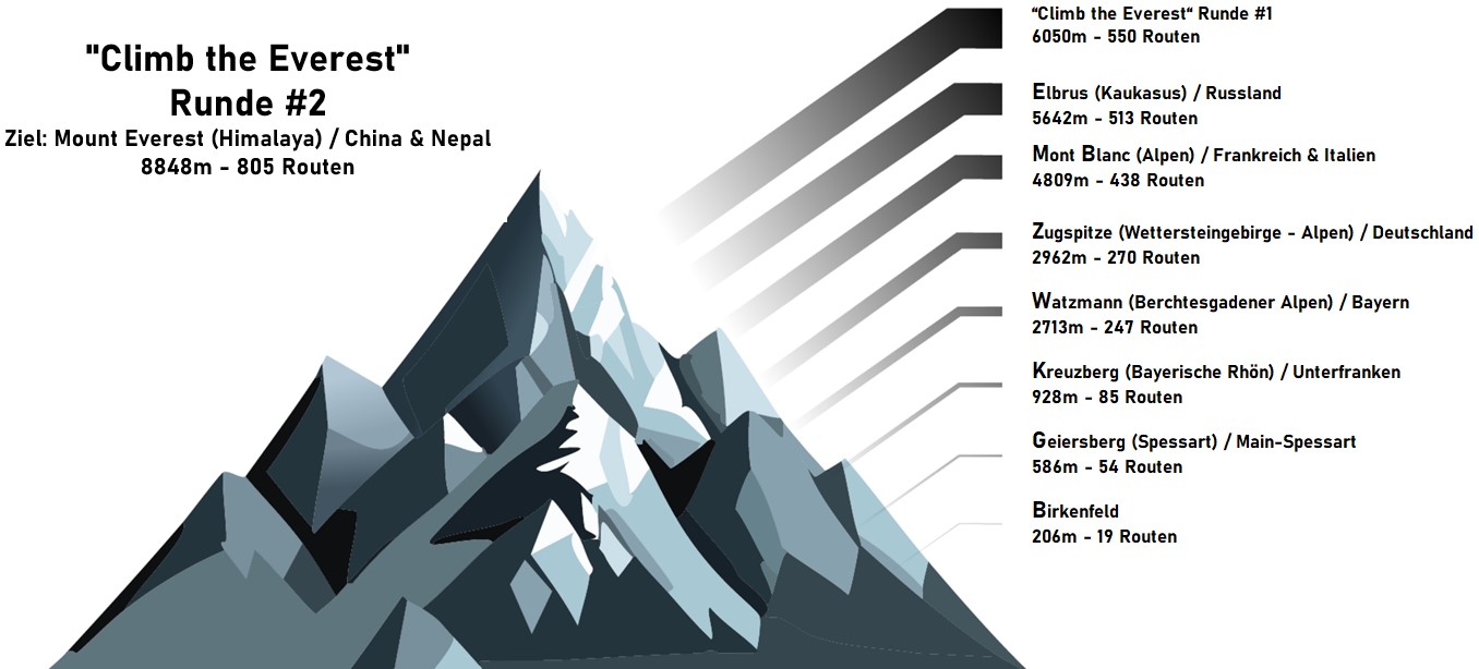 Route für Route á 11 m vom Meeresspiegel bis auf den Mount Everest (805 Routen). Diverse Zwischenziele wie Birkenfeld (19 Routen), dem Geiersberg (54 Routen) im Spessart, der Zugspitze (270 Routen) oder dem Elbrus (438 Routen) im Kaukasus möchten erklommen werden. Zu schlagen gilt es jedoch die 550 Routen von „Climb the Everest“ Runde #1, erklettert 2024 beim Tag der offenen Tür im Rahmen des Jubiläums 125 Jahre Sektion Main-Spessart des DAV.